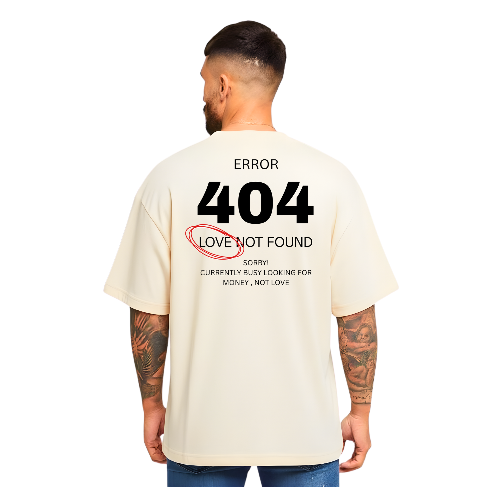 For the ones chasing goals, not feelings. This oversized black tee features a bold “ERROR 404 – Love Not Found” graphic on the back and a subtle anatomical heart print on the front. Crafted from soft, breathable cotton with a relaxed drop-shoulder fit, it’s the perfect blend of comfort and statement streetwear.