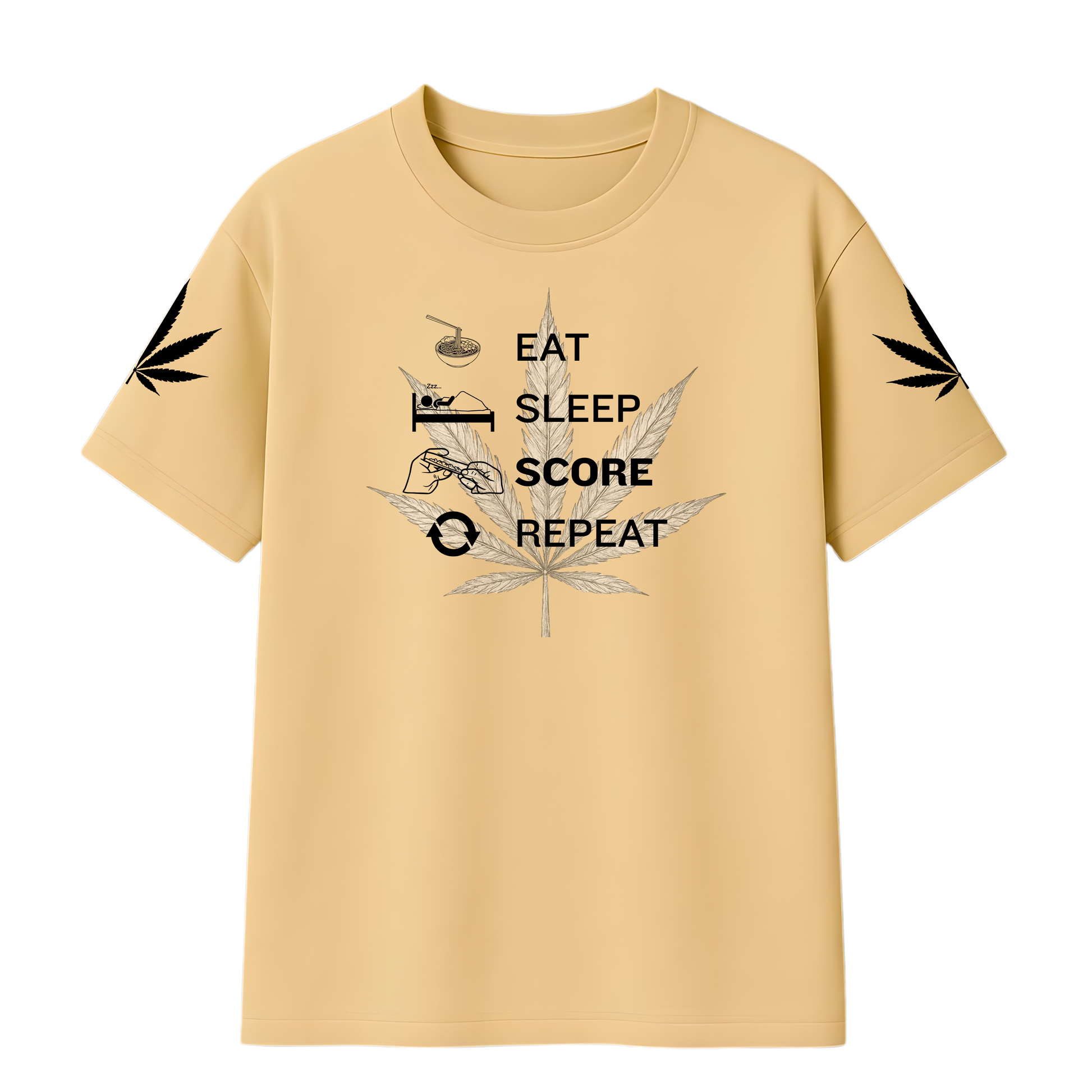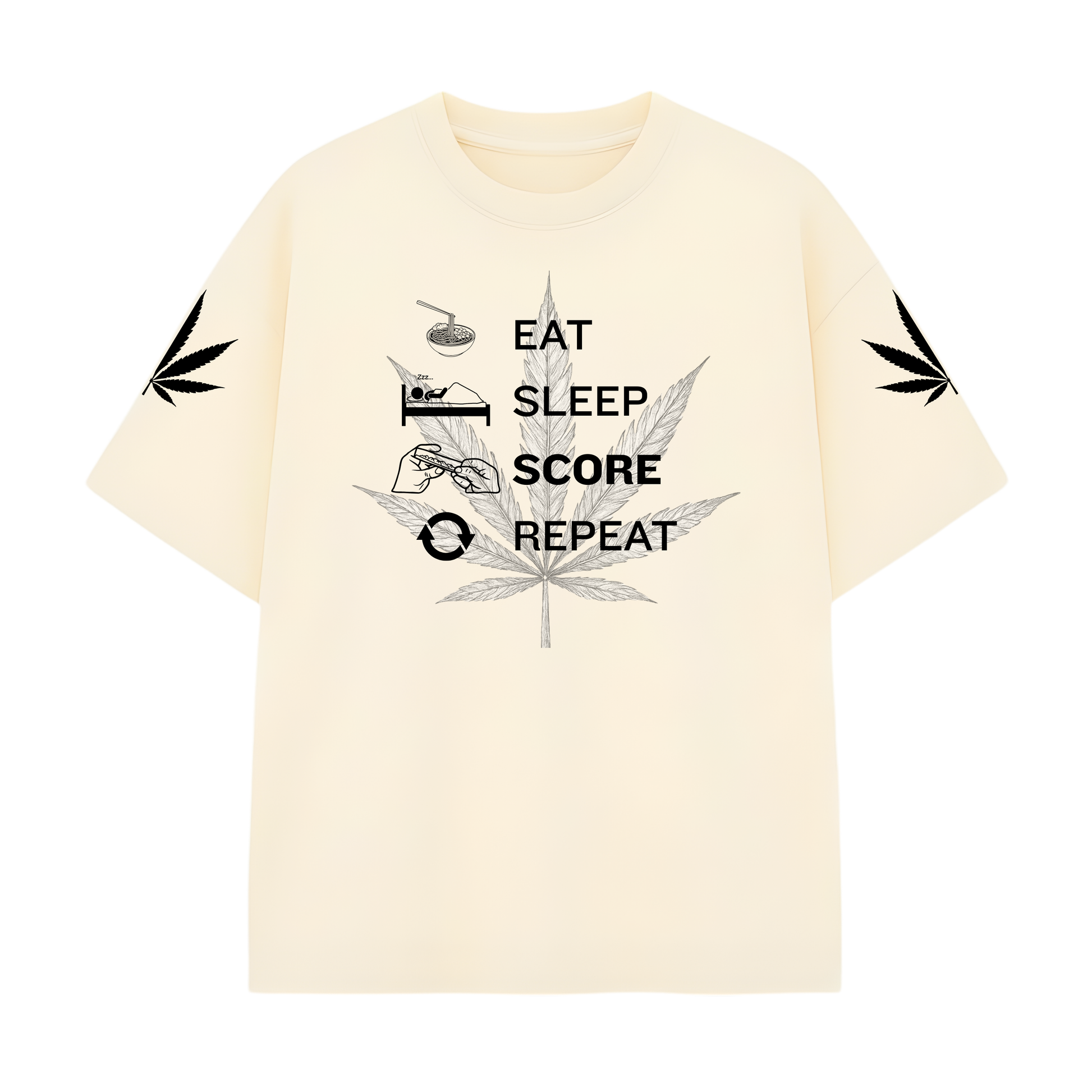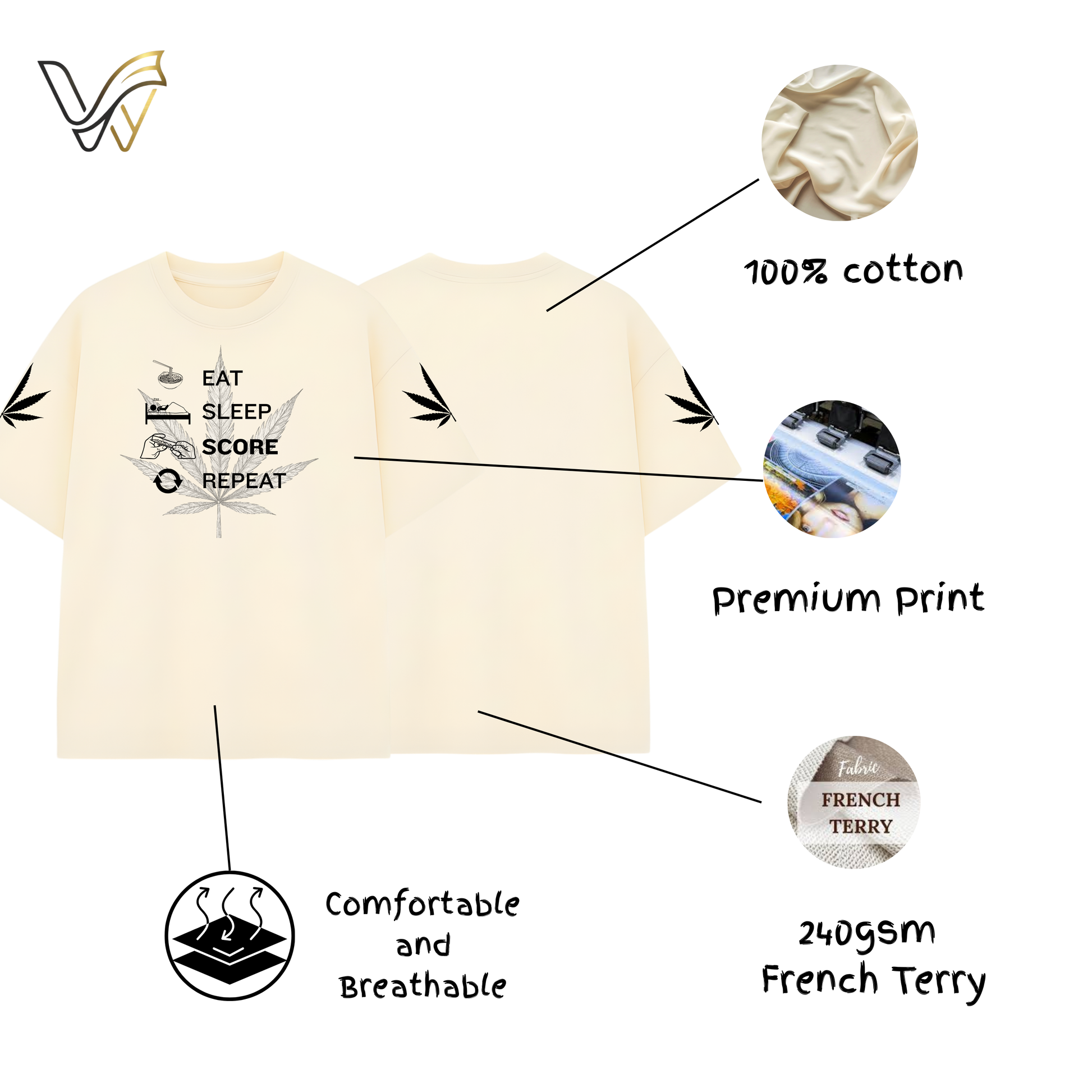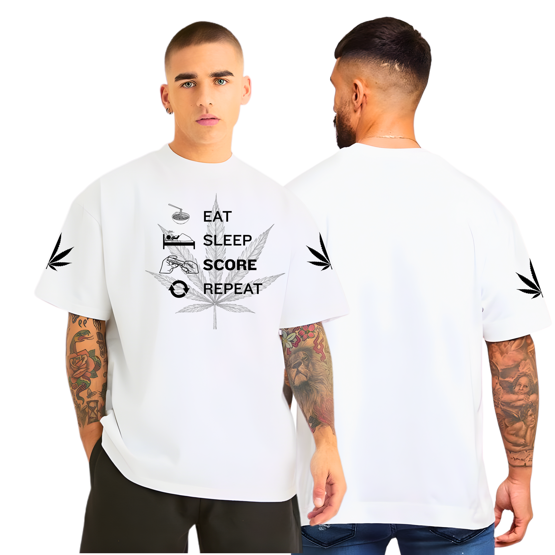 The Eat Sleep Score Repeat oversized tee captures the everyday hustle mindset with bold front typography and graphic elements layered over a statement leaf design. Finished with matching sleeve prints, this piece blends street attitude with effortless comfort.